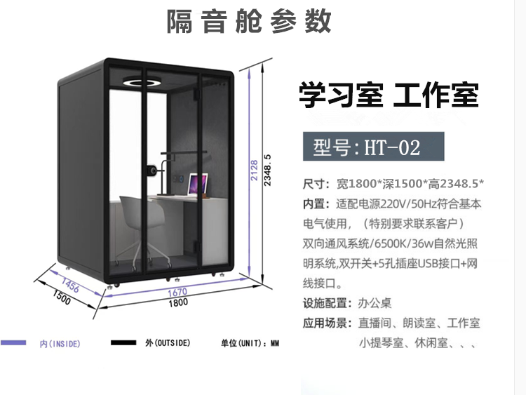 產品特點:移動隔音學習室,采用鋁型材框架,金屬殼體,靜電噴涂工藝,美觀大方。內飾板為環保吸聲裝飾材料,有效控制艙內混響時間,保證良好的艙內音質效果。地板由隔振層、隔聲層、防滑裝飾層多層組合,將隔音倉與地面的結構噪聲傳播途徑予以隔絕。大面積通透玻璃門窗,由多層夾膠安全玻璃構成中空結構,隔音又保溫。通過精良的加工生產工藝及精準的裝配咬合設計,隔音學習室整體的密封性非常好,為學習以及工作良好的隔音效果提供了重要保障。