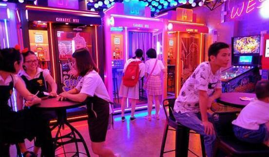 全民K歌在杭州開了第四家店自助K歌店。它由7間迷你KTV房、休閑娛樂區(qū)和休息區(qū)組成,占地約500平方米。其中,休閑娛樂區(qū)設(shè)有彈珠機、自助販售機、自助橙汁機等,頗為契合“自助”、“無人值守”的概念。看上去,這和傳統(tǒng)KTV、迷你KTV都不太一樣。